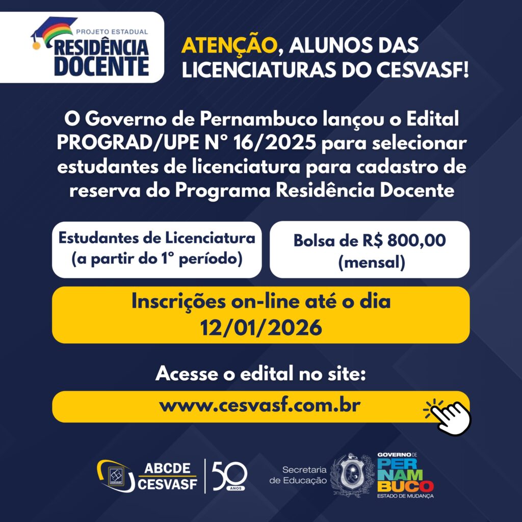 O Governo de Pernambuco lançou o Edital nº 16/2025 para selecionar estudantes de licenciatura das IES pernambucanas para cadastro de reserva do Programa Residência Docente.
