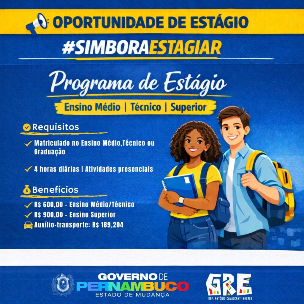 O maior programa de estágio de Pernambuco está com inscrições abertas! São mais de 26 mil vagas para estudantes que buscam experiência prática e protagonismo.