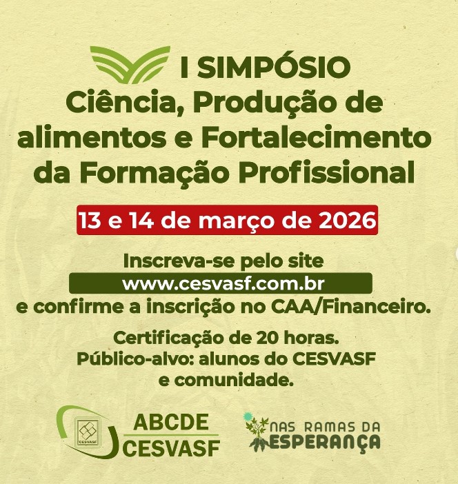 O Centro de Ensino Superior do Vale do São Francisco (CESVASF) realiza o I Simpósio Ciência, Produção de alimentos e Fortalecimento da Formação Profissional, em parceria com o inspirador projeto Nas Ramas da Esperança: Produção de Alimentos e Fortalecimento da Formação Profissional.