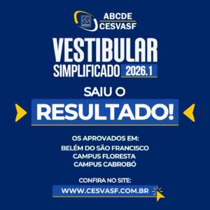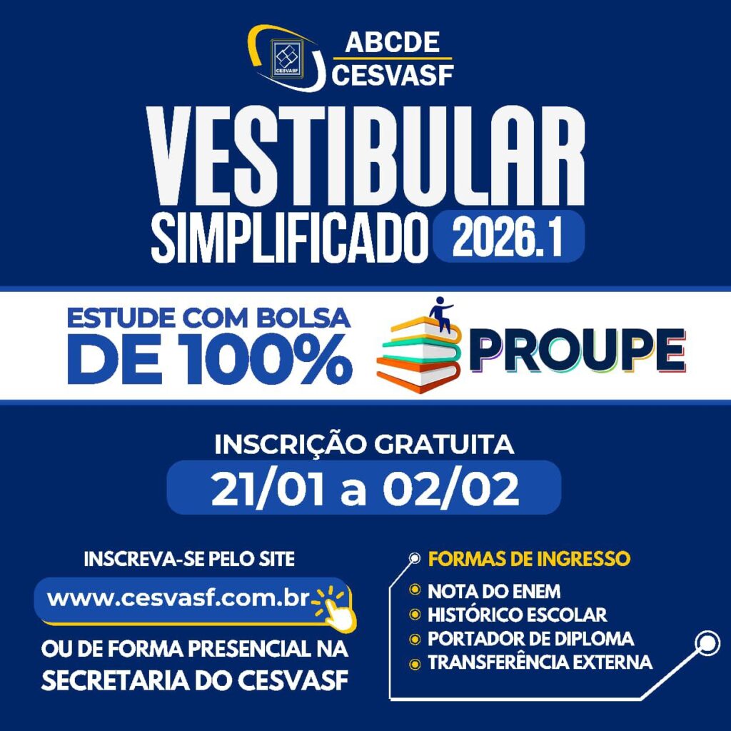 Estão abertas as inscrições gratuitas para o VESTIBULAR SIMPLIFICADO 2026.1 do CESVASF em Belém do São Francisco, Campus Floresta e Campus Cabrobó, mediante nota do ENEM, da análise do histórico escolar, como portador de diploma e por meio de transferência externa.